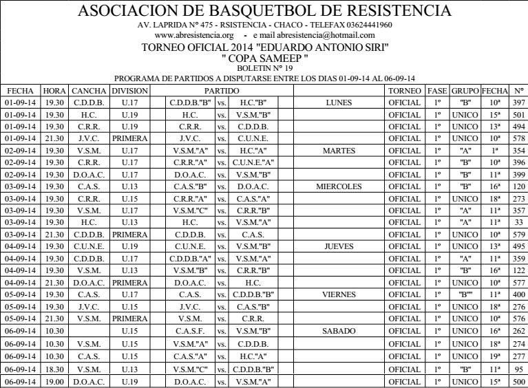 ASOCIACION DE BASQUETBOL DE RESISTENCIA. Programación de partidos de la ABR desde el 1 al 6 de septiembre de 2014.