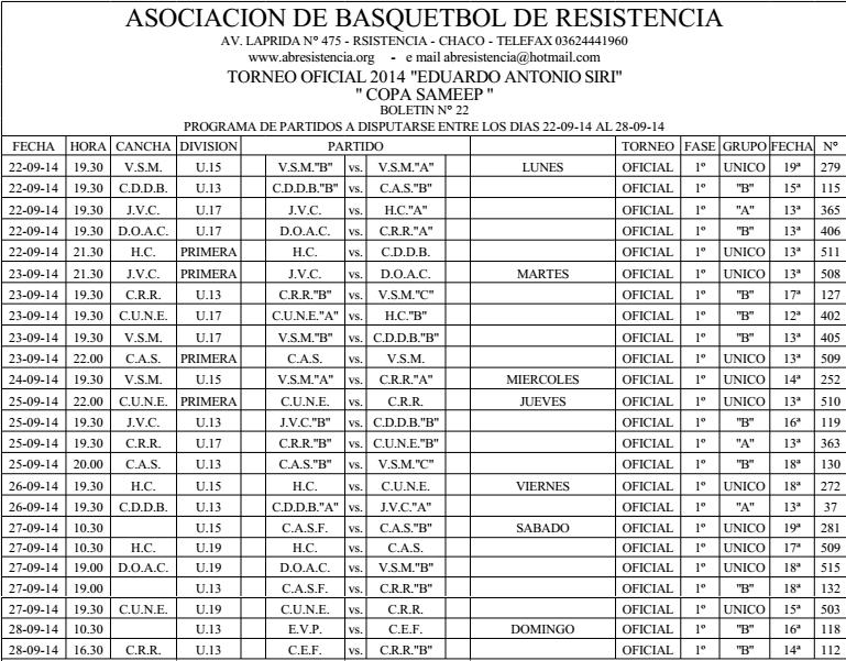 ASOCIACION DE BASQUETBOL DE RESISTENCIA. Programación de partidos de la ABR desde el 22 al 28 de septiembre de 2014.
