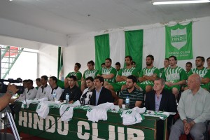 TORNEO FEDERAL DE BASQUETBOL. Con la presencia de su presidente, Gustavo Martínez, el Hindú Club presentó oficialmente su plantel para la temporada 2014/15 del TFB. Además del titular del bolido verde, estuvieron presentes, otros directivos del mismo como así también el cuerpo técnico -que lidera Jerónimo Trezza- y el equipo que el viernes debutará ante Municipal de Santa Rosa. Durante su discurso, Martínez no solo hizo hincapié en la importancia de éste proyecto que pone al Verde nuevamente en la competencia nacional, sino que reiteró aquéllo de la inclusión a través del deporte para niños y jóvenes. Además, se dejó bien en claro que el proyecto abarca dos años, ya que se extiende hasta el 2016. Por su parte el vice, Robertino Freschi, invitó a la sociedad en genral a ser parte del proyecto, acompañando al equipo en el estadio. Trezza, a su vez, expresó lo que es un anhelo de todos los amantes del basquet sostendiendo que “la idea es que en cada partido de Hindú, en la tribuna estén todas las divisiones formativas del club, desde el mini, para lograr la integración e identificación de los chicos y jóvenes con quienes los representan, en este caso, a nivel nacional”. Con ésta presentación -donde también se exhibió la nueva indumentaria- quedó inaugurada la nueva ilusión de Hindú en el plano nacional del basquet.