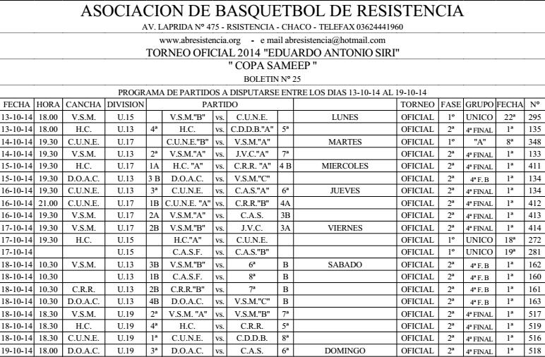 ASOCIACION DE BASQUETBOL DE RESISTENCIA. Programación de partidos de la ABR entre el 13 y el 19 de octubre de 2014.