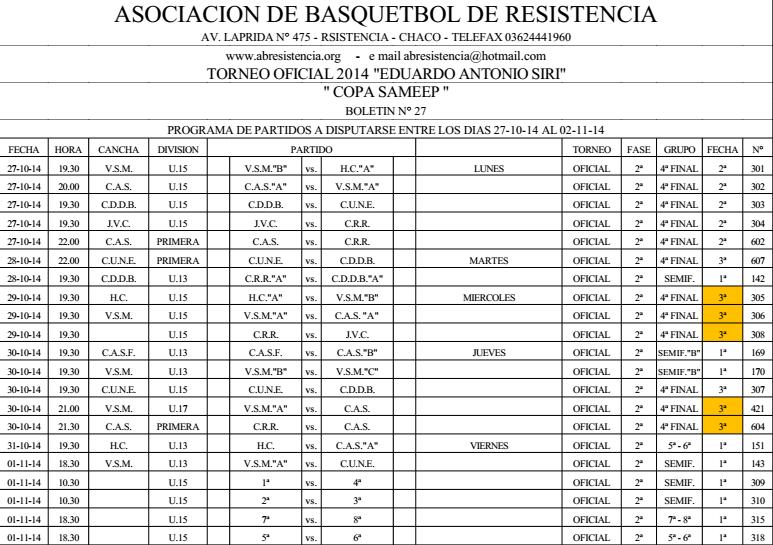 ASOCIACION DE BASQUETBOL DE RESISTENCIA. Programación de partidos de la ABR entre el 27 de octubre y el 2 de noviembre de 2014.