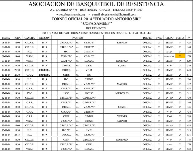 ASOCIACION DE BASQUETBOL DE RESISTENCIA. Programación de partidos de la ABR entre el 10 y el 16 de noviembre de 2014.