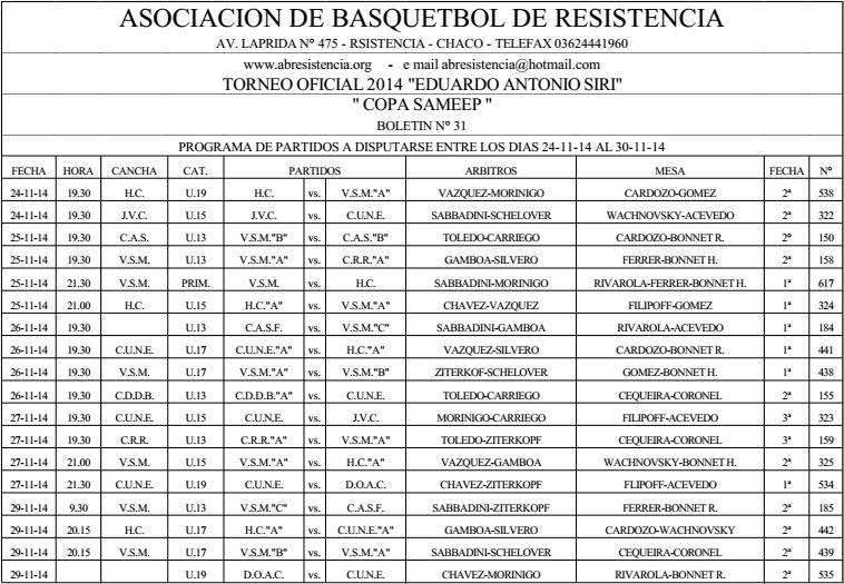 ASOCIACION DE BASQUETBOL DE RESISTENCIA. Programación de partidos de la ABR entre el 24 y el 30 de noviembre de 2014.