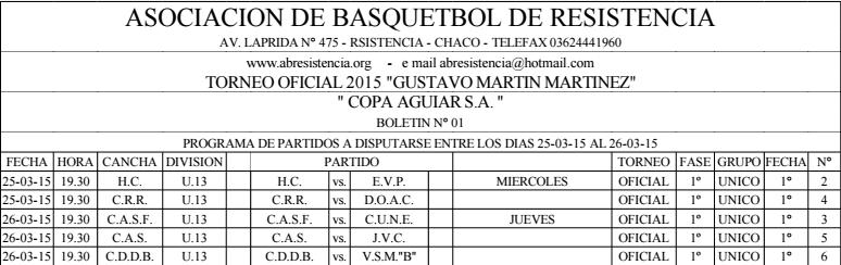 ASOCIACION DE BASQUETBOL DE RESISTENCIA. Programación de la ABR entre el 25 y el 26 de Marzo de 2015.