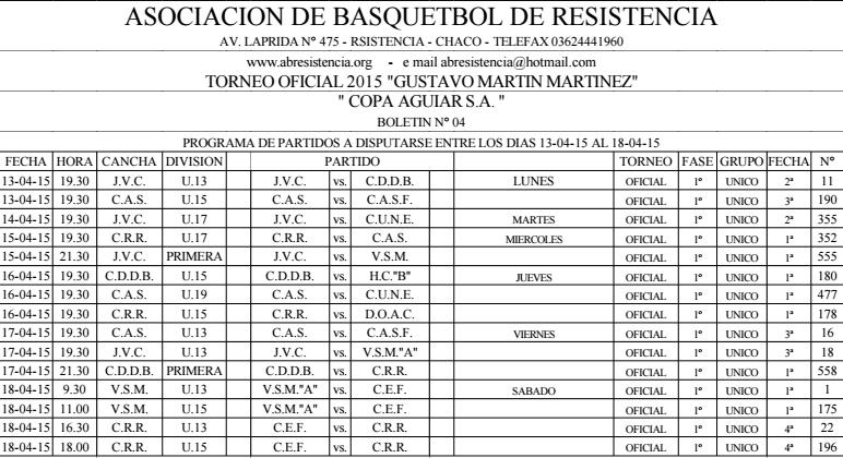 ASOCIACION DE BASQUETBOL DE RESISTENCIA. Programación de la ABR entre el 13 y el 18 de abril de 2015.